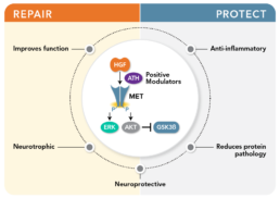 Our small molecules are designed to restore neuronal health by enhancing the naturally occurring neurotrophic hepatocyte growth factor (HGF) system. We have shown preclinically that enhancing the HGF signaling system has the potential to reduce inflammation, slow neurodegeneration, and provide neuroprotection. Subject to ongoing clinical testing, we believe our small molecules have the potential to modify the course of disease for patients across a broad range of neurodegenerative diseases.